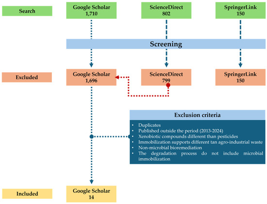 Based on the information obtained from the systematic search across three databases (Google Scholar, Science Direct, and Springer Link), using the search equation (microorganism + immobilization + pesticide + agro-waste + water) for the period 2013–2024, a total of 1710 articles were found on Google Scholar. Of these, only 14 articles (0.82%) met the inclusion criteria (Table 1), while the remaining 1695 were excluded for failing to meet the established criteria. In Springer Link, 150 articles were found. However, none of these articles met the inclusion criteria. In ScienceDirect, 802 articles were identified, of which only three met the inclusion criteria; however, these three studies had already been identified in Google Scholar, so they were discarded (Figure 1). A data matrix was generated in Windows-Excel with the information of all the identified articles. After filtering them according to the inclusion and exclusion criteria, the selected articles were reviewed by at least three authors independently.