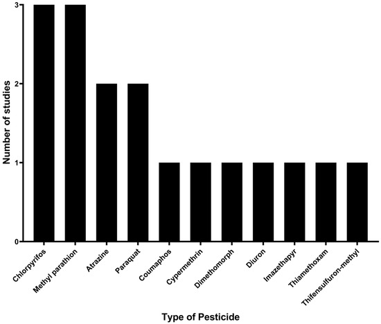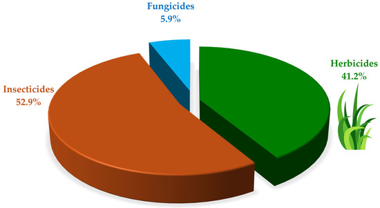 Currently, approximately 3.6 million tons of pesticides are used worldwide, mainly in China, the United States, and Argentina, of which 52.6% are herbicides, 20.9% are insecticides, 21.5% are fungicides and bactericides, and 5% are other types of pesticides [15,30,66,67]. This aligns with the findings of this study, where insecticides and herbicides were the most representative pesticides, mainly chlorpyrifos, methyl parathion, atrazine and paraquat.
