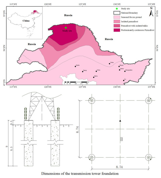 The study area is located in Mohe County, Heilongjiang Province, China, with geographic coordinates at 122.6° E and 52.95° N (Figure 1). It lies at the northern foothills of the Da Xing’anling Mountains, within a cold temperate climate zone. The annual average temperature is below −3 °C, with long and cold winters where temperatures can drop as low as −40 °C and short, cool summers. The annual precipitation is approximately 400–500 mm, with most rainfall occurring in the summer. The terrain mainly consists of low mountains, hills, and plains, with a high forest coverage and abundant wetland resources. Permafrost is widely distributed in the region, with deep frozen soil layers that are gradually degrading due to climate change. The overhead transmission line towers are supported by a foundation of four cast-in-situ piles, each with a diameter of 1 m and a length of 9 m (8.5 m underground). The foundation root span measures 8.74 m, and the construction was completed in April 2010. The surrounding strata include loam, silty clay, sandy gravel, and bedrock. This study sets up two scenarios, Case 1 and Case 2, which correspond to the conventional pile (CP) and a TPCT in pile (TP) schemes.