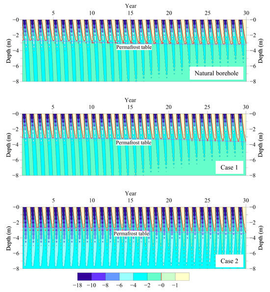 Figure 3 illustrates the freeze–thaw process of natural boreholes and two types of pile schemes. It is evident that, with the continued rise in temperature, the permafrost table gradually descends. Over the 30-year period, the permafrost table at the three monitoring locations dropped by 0.29 m, 0.43 m, and 0.30 m, respectively. In terms of the rate of descent, the depth of the permafrost table at the three locations descended at rates of 0.1 m, 0.12 m, and 0.05 m per decade during the first 10 years; 0.08 m, 0.14 m, and 0.12 m per decade between 10 and 20 years; and 0.11 m, 0.18 m, and 0.13 m per decade between 20 and 30 years. Regarding the degree of permafrost degradation, the CP scheme exhibited the most significant degradation, followed by the TP scheme, while the degradation in the natural borehole was comparatively less pronounced. By the 10th year, the depths of the permafrost table at the three locations were 3.01 m, 3.33 m, and 3.18 m, respectively. By the 20th year, these depths had increased to 3.08 m, 3.46 m, and 3.30 m. By year 30, the permafrost tables at the three locations had descended to depths of 3.2 m, 3.64 m, and 3.44 m. At this point, the CP scheme’s permafrost table was 0.2 m deeper than the TP scheme and 0.44 m deeper than the natural borehole. This indicates that the cooling effect of the TPCT has alleviated the downward movement of the permafrost table to some extent. Furthermore, the permafrost table at both pile sites is deeper than at the natural borehole, suggesting that the thermal conductivity of the pile foundation material has increased the rate of soil thawing and heat absorption during the warm season. As for the deep soil temperature, all three locations showed an increasing trend due to climate warming. The temperature rise at the natural borehole and CP scheme pile sites was more pronounced, while the TP scheme exhibited a slower increase in temperature due to the cooling effect of the TPCT. Additionally, Case 2 showed significantly lower deep soil temperatures compared to both the natural borehole and Case 1. Between years 20 and 30, the deep soil temperature at the natural borehole and Case 1 ranged from 0 °C to −2 °C, while in Case 2, certain areas had temperatures lower than −2 °C, with the −4 °C isotherm extending to depths below 7 m. While the integration of TPCTs into cast-in-place pile foundations effectively lowers deep soil temperatures surrounding the piles, their capacity to regulate the permafrost table remains constrained.
