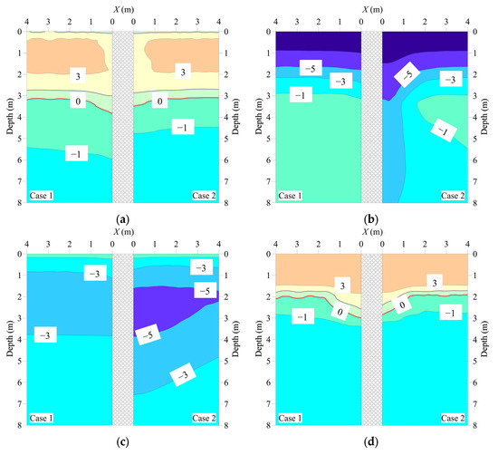 Figure 4 shows the temperature distribution around the piles for the two schemes. From the comparison of the temperature fields at four different time points, it is clear that on 15 October, the temperature difference between the two conditions with and without TPCT primarily occurs in the deeper layers. The −1 °C isotherm on the pile side in Case 2 is noticeably higher than in Case 1, and within the 5–8 m depth range on the pile side of Case 2, the soil temperature is below −1 °C. However, the position of the 0 °C isotherm in both cases does not show significant differences. As winter sets in, the TPCT begins to operate, cooling the pile. The pile-side temperature in the TP scheme decreases significantly, and by 15 January, the temperature on the pile side is completely below −3 °C, as indicated by the −3 °C isotherm. In contrast, most of the pile temperature in the CP scheme remains above −1 °C, with the area where the temperature is above −1 °C significantly larger than in the TP scheme. Then, as the temperature gradually rises, the efficiency of the TPCT decreases. By 15 April, the temperature difference between the two schemes has reduced, especially in the TP scheme, where the pile-side temperature shows an upward trend. Compared to January, both the shallow and deep pile temperatures have risen, as indicated by the −3 °C isotherm. At this point, the temperature distribution around the TP scheme piles tends to become more uniform. After winter, as temperatures rise and the TPCT stops working, the soil near the TP scheme pile reaches a steady ground temperature, continuing to absorb heat from the surrounding relatively warmer soil. By 15 July, the temperature distributions for both conditions show very little difference, as seen in the −1 °C, 0 °C, and 3 °C isotherms. Overall, during the cold period, the TPCT provides significant cooling and offers a marked low-temperature advantage. However, as the warm season progresses and the TPCT ceases to function, this low-temperature advantage gradually diminishes. Notably, by the end of the warm season, the TP scheme still retains some low-temperature advantage in the deeper layers, as shown in Figure 4a.