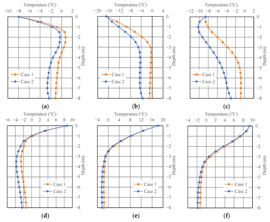 Temperature profiles along the sides of the pile foundations. (a) November 15th; (b) January 15th; (c) March 15th; (d) May 15th; (e) July 15th; (f) September 15th.