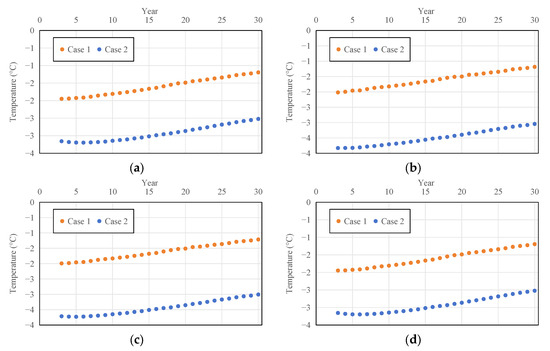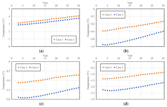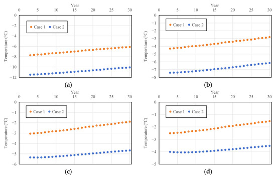 Variation in annual minimum temperature on the pile side. (a) Depth = 2 m, (b) Depth = 4 m, (c) Depth = 6 m, (d) Depth = 8 m.