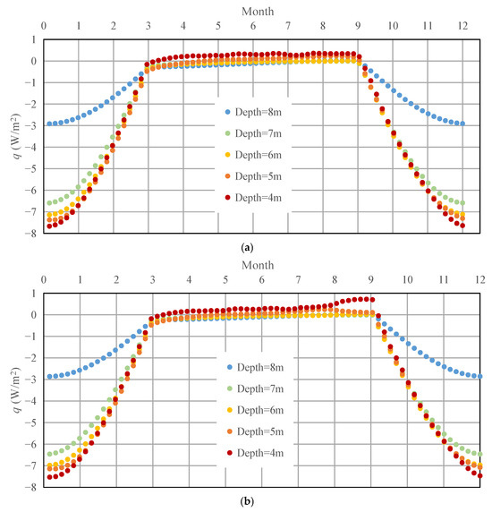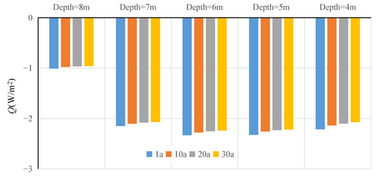 Figure 9 presents the annual average heat flux at the pile side in the TP scheme. First, in terms of the time dimension, the cooling efficiency of the device shows a slight decline as the temperature increases. For depths between 4 m and 8 m, the cooling efficiency decreases by 4% to 6% over the course of 30 years. In terms of spatial variation, the device exhibits higher cooling efficiency at depths between 5 m and 6 m, where the annual average heat flux at the pile side ranges from −2.22 to −2.33 W/m2. To understand the operating conditions of the TP scheme, Figure 10 illustrates the variation of heat flux along the pile side. In terms of operation time, the TP scheme mainly functions from early October to the end of March of the following year, with the remainder of the time being spent in a shutdown state. As winter arrives and temperatures gradually decrease, the cooling efficiency of the TP scheme strengthens, reaching its peak in early January. Then, as the temperature rises, the heat absorption efficiency of the pile side gradually weakens. Notably, during the warm season, the pile exhibits a heat release state in relation to the surrounding soil. This phenomenon is observed at depths greater than 6 m, primarily due to heat in the air being transferred more rapidly through the pile foundation to the underground soil, causing the pile temperature in certain depth ranges to be higher than that of the surrounding soil, thus exhibiting a heat release state.