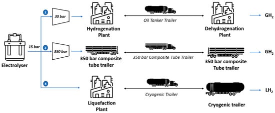- Hurskainen, M.; Ihonen, J. Techno-Economic Feasibility of Road Transport of Hydrogen Using Liquid Organic Hydrogen Carriers. Int. J. Hydrogen Energy 2020, 45, 32098–32112. [Google Scholar] [CrossRef]
