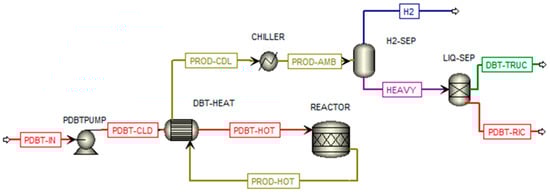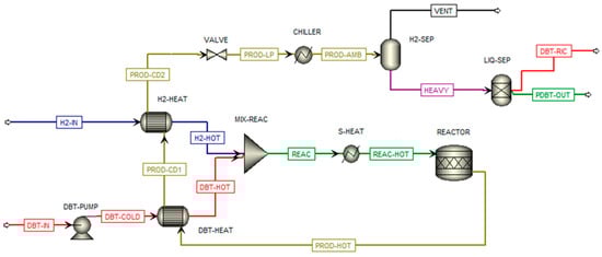 Hydrogenation and dehydrogenation reactors for the DBT/PDBT system were configured in ASPEN Plus along with the entire balance of plant (BOP), including pumps, heat exchangers, and separators, following the layout presented by Eypasch et al. [23].