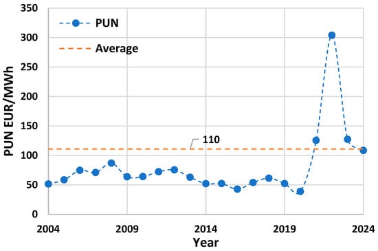 In this study, electricity is assumed to be supplied via a virtual PPA from the Italian national grid with monthly temporal correlation. The levelized cost of electricity (LCOE) has been estimated based on 0.14 EUR/kWh, the average of Italian PUN, short for “Prezzo Unico Nazionale” or National Single Price, between 2004 and 2024 [29], with the addition of average system charges amounting to 30–40 EUR/MWh [30]. The historical trend of the Italian PUN (2004–2024) is depicted in Figure 4.
