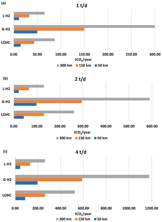 Two representative scenarios were considered: a small-scale case (1 t/d) and a large-scale case (4 t/d), both at 150 km, a distance at which LOHC transport begins to compete with compressed hydrogen, as shown in Section 4.3.