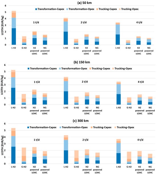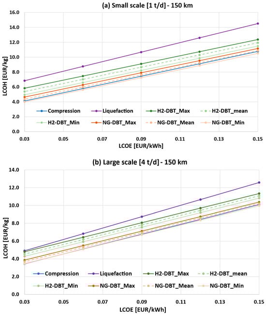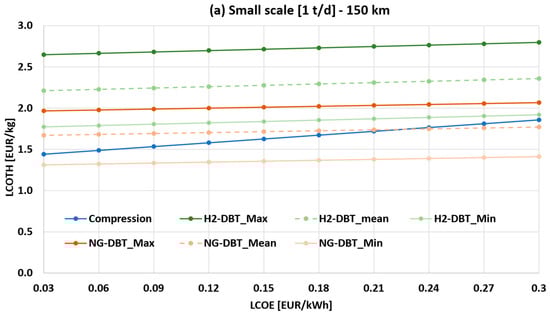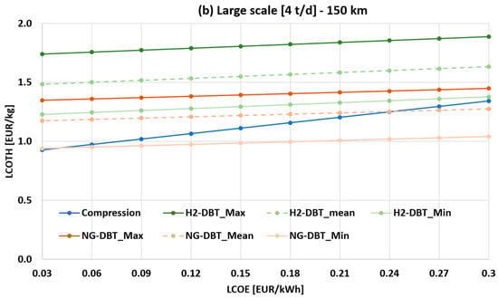 Figure 7a,b show the sensitivity analysis of the LCOTH as a function of LCOE and capital cost assumptions for the DBT/PDBT system (both H2- and NG-powered systems), at 150 km transport distance for the 1 t/d case (small scale) and 4 t/d case (large scale), respectively. The liquid hydrogen scenario is not reported, as it is consistently uncompetitive within this range.