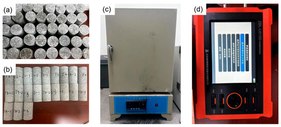 Figure 2d). For ultrasonic measurements, piezoelectric transducers were mounted on opposite specimen ends, with a uniform coupling layer achieved through application of acoustic-grade petroleum jelly to optimize ultrasonic signal transmission. Subsequent thermal conditioning was conducted in a programmable muffle furnace (