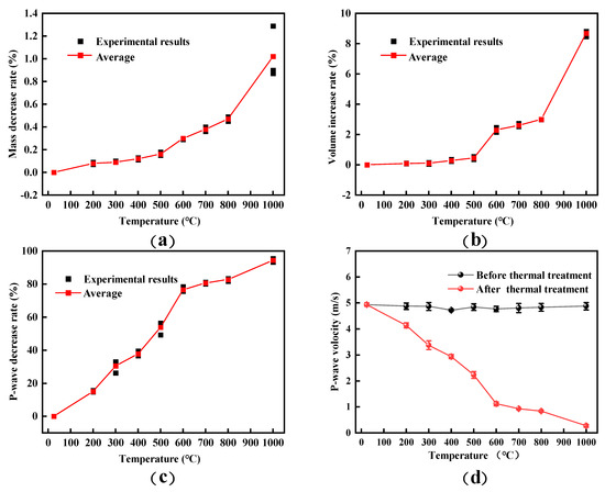 Figure 4a presents the temperature-dependent mass loss profile of the heat-treated granite, indicating a progressive decrease in sample mass with rising temperatures. Below 500 °C, the mass loss rate exhibited a gradual increase, while reaching 600 °C triggered a sharp decline in mass. This rate accelerated further at 1000 °C, culminating in a total mass loss of 1.02%, primarily attributed to the combined evaporation of free and bound water. Notably, at 1000 °C significant data variability emerged among triplicate samples, which was caused by minor surface detachment phenomena observed during thermal treatment.