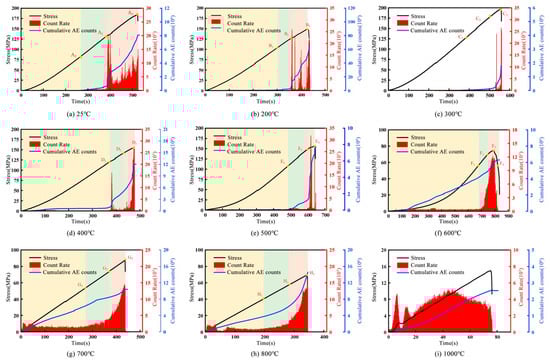 Figure 7d,e) revealed modified AE characteristics, particularly the nonlinear progression in the Stage II AE evolution, contrasting with the linear pattern observed in low-temperature counterparts. This behavioral shift arises from the activation and propagation of thermally induced microcracks under compressive loading. When subjected to 600–800 °C treatments (