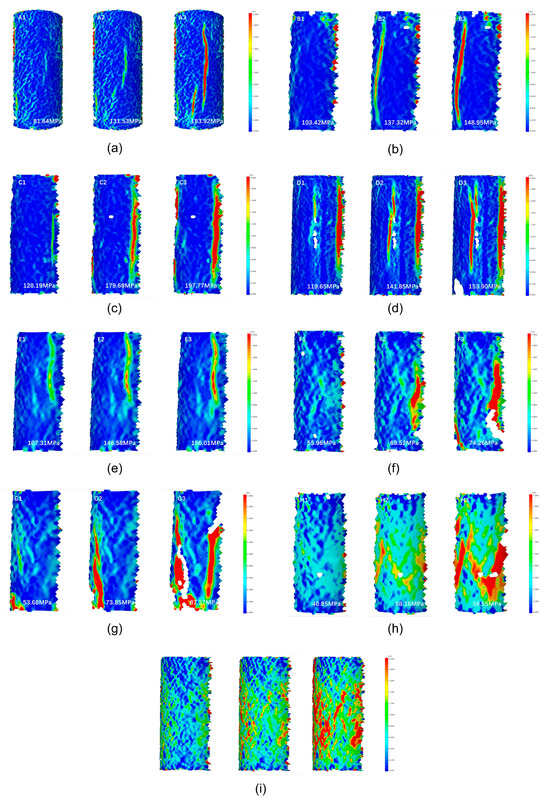 Figure 7a–e). The strain localization initially develops in the central region when axial stress attains the crack initiation threshold. The localized strain intensifies with increasing axial stress, culminating in a longitudinal high-strain zone formation at the damage stress threshold. During the unstable crack propagation, high-strain zones propagate radially while a secondary crack formation occurs. These processes ultimately result in macroscopic fracture networks that precipitate catastrophic failure.