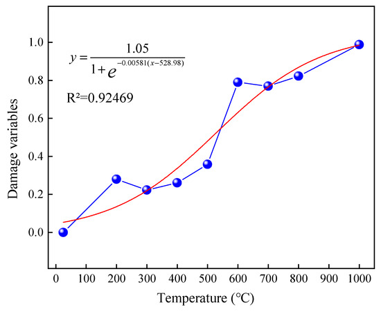 Figure 9, the damage variable of granite increases progressively with rising temperatures. However, when the temperature of granite increases from 200 °C to 300 °C, the damage variable decreases. This phenomenon is attributable to thermal stress, which closes the internal pores of granite and improves the overall integrity of the specimen. As the temperature continues to rise, the thermal stress induces the formation of both transgranular and intergranular cracks within the granite’s internal minerals, causing the damage variable to increase gradually and the deformation resistance of the granite specimen to weaken. Upon reaching 600 °C, the damage variable escalates rapidly due to the phase transformation of quartz within the granite, resulting in a significant increase in internal pores. At 1000 °C, the granite almost completely loses its ability to resist deformation. The evolution of thermal damage variables with temperature exhibits a triphasic pattern consistent with the stages previously described.