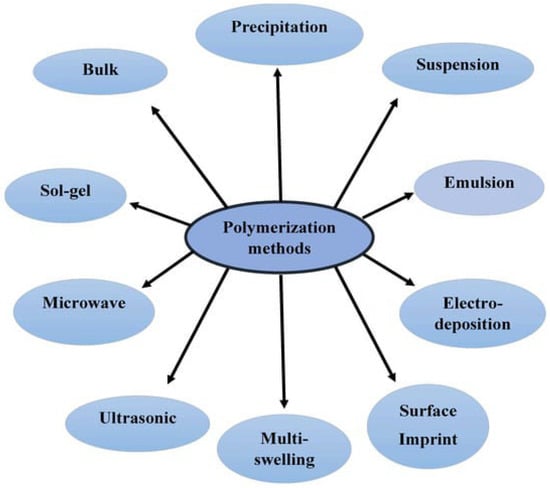 MIPs, a class of advanced functional materials, have recently gained attention as a promising alternative for the removal of EPs. MIPs are synthetic polymers engineered with molecular recognition sites designed to selectively mimic the shape, size, and functional groups of the target pollutant molecule [24,25]. MIPs can be specifically designed to selectively recognize and bind the target pollutant, enhancing the adsorption and degradation process while minimizing interference from other coexisting compounds via diverse polymerization techniques (Figure 1). This selective binding ability results in high removal efficiency and reduced potential for the generation of harmful byproducts.