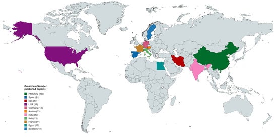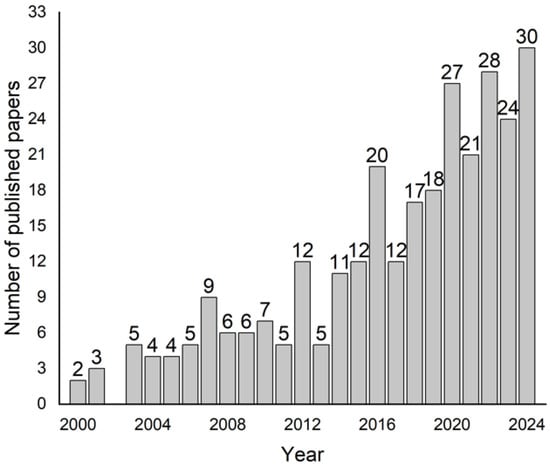 Applying the search criteria described in the Section 2, 315 published research papers were found and registered in the database reviewed. Figure 2 shows a significant increase over time in the scientific literature related to the use of MIPs for degradation purposes from 2000 onwards. The information demonstrates a steady upward trend, with notable growth over the years. In the early 2000s, publication numbers were relatively low, starting from two papers in 2000 and gradually increasing to nine papers by 2008. From 2010 onward, the rate of publication accelerated, peaking significantly in recent years. The most substantial growth occurs from 2016 onwards, with publications consistently rising each year. In 2020, there was a marked increase to 27 papers, and this growth continues, reaching 30 papers in 2024. It is necessary to note that of the 315 published works, 293 were published after 2000, and of those, 45% were published in the past five years (2020–2024). Over the past five years, 130 publications have addressed this issue, with the largest number appearing this year, as depicted in Figure 1. This significant increase in publications since 2020 is likely due to several factors, including advancements in materials science, particularly in the synthesis of more efficient MIPs, and the growing global emphasis on sustainability. The surge in research activity can also be attributed to increased funding, international collaborations, and a heightened awareness of the need for sustainable solutions to environmental and health-related challenges. This trend reflects the expanding interest in the field and emphasizes the increasing significance of MIPs in addressing pressing global issues, such as water pollution and health crises, further driving their growing impact on the scientific community.