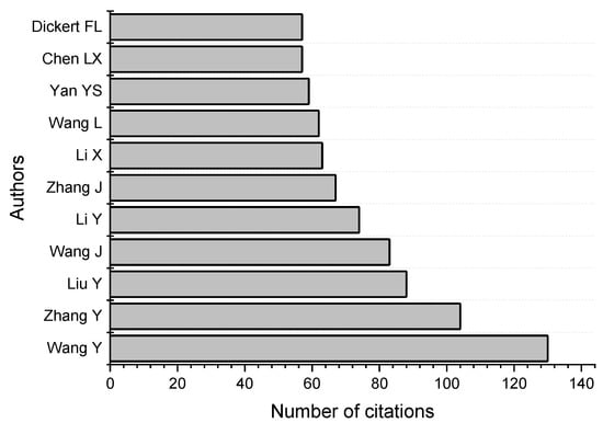 Table 2 presents the top five leading authors, ranked by the number of publications they have contributed on this topic, while Figure 6 illustrates the top 10 most cited authors in this field. Wang Y. is the most cited author with 130 citations, followed by Zhang Y. with 104 citations, and Liu Y. with 88 citations.