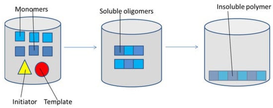 Precipitation polymerization schematic mechanism. Reprinted from Parisi et al., 2022 [45] under the terms of the Creative Commons Attribution (CC BY) license.