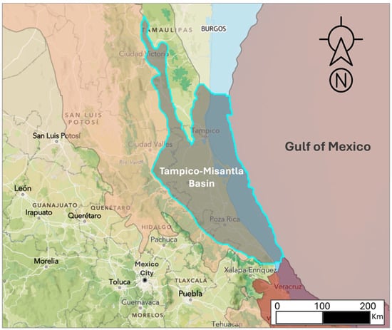 The Tampico-Misantla Basin in Mexico is one of the most significant hydrocarbon-producing regions in the country, characterized by a complex lithological framework including the El Abra Formation, a carbonate-based formation recognized for its high potential for CO2 storage. Located in eastern Mexico along the Gulf Coast, between the states of Tamaulipas and Veracruz, the Tampico-Misantla Basin’s geographical context is shown in Figure 1. Recent studies have identified two principal aquifers, the Cretaceous Tamaulipas and Jurassic Cahuasas formations, as suitable candidates for CO2 storage, with an estimated adequate storage capacity of 972.3 to 1346.0 million tons of CO2 [5,6].