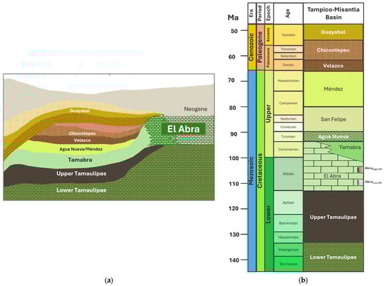 Schematic representation of the tectonic and stratigraphic framework of the El Abra Formation in the Tampico-Misantla Basin: (a) Basin profile showing depth variations of the El Abra Formation, highlighting subsidence processes associated with the passive margin; (b) Stratigraphic column of the El Abra Formation, indicating predominant facies and marking the study samples analyzed in this work.