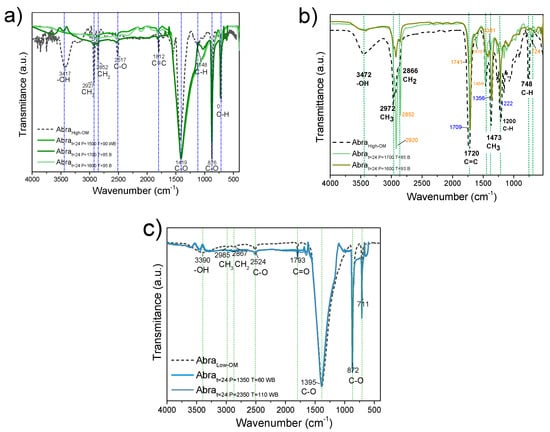 FTIR spectra for Abra samples (a) with high content of OM (AbraHigh-OM), (b) released-extract, and (c) low content of OM (AbraLow-OM), after CO2 injection.