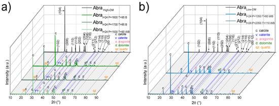 The primary and most intense crystallographic plane exhibited the same tendency, with increases of approximately 1.43°, 1.58°, and 1.65° as the pressure decreased. All signals present the same tendency. This behavior has been detected in ambient CO2 capture and mineral carbonation [48,49]. Another observation is that the presence of brine does not affect the crystallographic structure. Therefore, pressure and temperature are parameters that can modify the crystalline structure of the Abra cores. The pressure effect during CO2 injection induces the dissolution and precipitation of new mineral phases, such as vaterite, aragonite, dolomite, and quartz, as observed in 5a. On the other hand, the XRD pattern of the Abra core with low OM content (5b) displayed a shifting of all crystallographic planes compared with that of high OM content, which was c.a. 0.389°. The presence of OM tends to change the lattice [50]. After CO2 injection, the shifting of the signals was very smooth, since there was only a modification of 0.105° and 0.2105°, which shifted to low 2θ values. This observation is interesting, since it displays the contrary effect when organic matter is present. Stresses are responsible for the shifts in crystallographic planes, either towards higher or lower values. An increase in spacing corresponds to lower 2θ values, while a decrease in spacing results in higher 2θ values [51]. The shifting toward low values has also been reported to be due to the increase of pore diameter [52]. Therefore, this work demonstrates that the presence of a low OM increases the lattice parameters, whereas a high OM content decreases them.