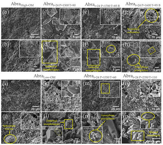 SEM micrographs of El Abra Formation samples under varying experimental conditions. (a) AbraHigh-OM: dense calcite crystals with euhedral to subhedral morphologies (average size: 13 μm), (b) AbraHigh-OM: euhedral to subhedral calcite crystals with well-defined angular faces, (c,d) Abrat=24 P=1500 T=90 WB: irregular crystal morphologies after CO2 injection, showing secondary carbonate precipitation (yellow highlights). (e,f) Abrat=24 P=1700 T=85 B: varied crystal morphologies influenced by brine (B), promoting metastable phases like vaterite, (g,h) Abrat=24 P=1600 T=95 B: well-defined crystal growth, highlighting brine’s role in stabilizing secondary carbonates, (i–l) AbraLow-OM: tiny calcite crystals (average size: 1.6 μm) with spheroidal vaterite particles, indicating low OM content and high porosity, (m,n) Abrat=24 P=1350 T=60 WB: prismatic calcite with amorphous precipitates, suggesting less stable phases under lower pressure and temperature, (o,p) Abrat=24 P=2350 T=110 WB: euhedral crystals with amorphous precipitates, consistent with high-pressure conditions favoring metastable phases.