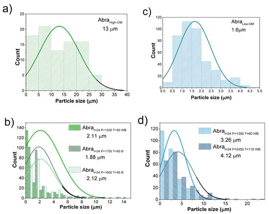 On the other hand, the AbraLow-OM samples exhibited an increase in particle size following treatment. The average particle size increased from 1.6 μm in the untreated state to 3.26 μm (Abrat=24 P=1350 T=60 WB) and 4.12 μm (Abrat=24 P=2350 T=110 WB) post-injection, indicating that recrystallization and grain growth processes are more dominant when OM is limited [53,54].