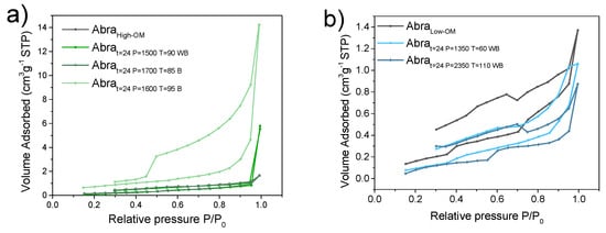 Nitrogen adsorption isotherms (Figure 8) provide valuable information on the porous structure of the treated samples. The isotherms of samples Abrat=24 P=1500 T=90 WB, Abrat=24 P=1700 T=85 B, and Abrat=24 P=1600 T=95 B showed higher nitrogen adsorption than AbraHigh-OM. This confirms that the porosity and the accessible surface area increased after the injection of CO2 [56]. Sample Abrat=24 P=1600 T=95 B presented the isotherm with the highest adsorption, which correlated with its high BET surface area value (Figure 8a).