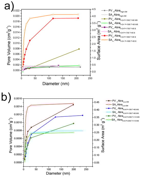In contrast, the low-organic-matter samples in Figure 9b indicated that the original AbraLow-OM sample exhibited a low pore volume and surface area across the entire diameter range. The treated sample Abrat=24 P=2350 T=110 WB showed a slight increase in pore volume compared with the original sample. Still, the surface area remained small, suggesting the presence of larger pores (macropores) in a smaller proportion.