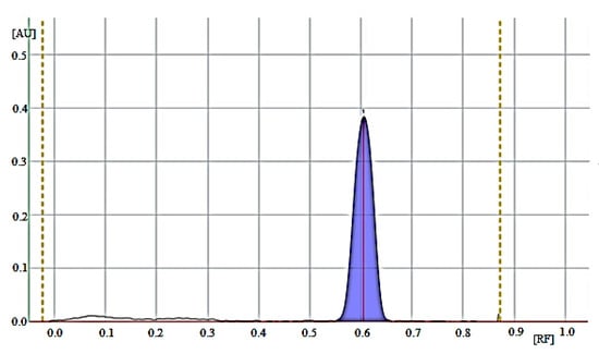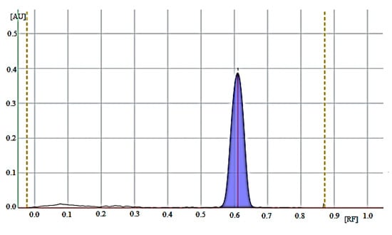The quantitative determination of donepezil in pharmaceutical preparations was performed by analyzing the measurements of chromatographic bands in Cogiton (donepezil 5 mg) and Donecept (donepezil 5 mg) drug solutions in the high (1.0–5.0 µg/spot) and low (0.2–1.0 µg/spot) linearity range. Drug extract samples at concentrations of 1, 3, and 5 µg/spot were tested, and the real donepezil content in the drugs was calculated from the calibration curve given in Table 1. Drug extract samples at concentrations of 0.2, 0.6, and 1.0 µg/spot were tested, and the real donepezil content in the drugs was calculated from the calibration curve given in Table 1. Figure 3, Figure 4 and Figure S27 show the densitogram of donepezil standard and the densitograms of donepezil from the Cogiton and Donecept tablets, respectively. No additional chromatographic bands were detected on the analyzed densitograms, i.e., no contamination was detected in the donepezil tablets. It was also observed that the excipients present in the formulations did not interfere with donepezil bands. The RF value of donepezil standard was consistent with the RF of donepezil from both drugs, i.e., Cogiton and Donecept (RF = 0.62 ± 0.03). The spectra of donepezil standard were also consistent with the spectrum of donepezil from the Cogiton (Figure 5) and Donecept (Figure S28) tablets. The peak purities of donepezil from the Cogiton and Donecept tablets were also assessed by comparing the spectra obtained from donepezil standard at the peak start (S), peak apex (M), and peak end (E) of the spot. It was found that r(S,M) > 0.999, and r(M,E) > 0.999. The compatibility of the spectrodensitograms of the donepezil standard with the spectrodensitograms of the donepezil from tablets confirms a high selectivity of the developed TLC method.