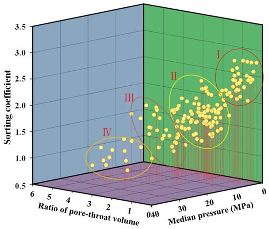 The dual-provenance system significantly intensifies reservoir heterogeneity and amplifies disparities in porosity–permeability parameters. The microscopic pore structure of the reservoir encompasses the geometric shape, size, distribution, connectivity, and proportion of pores and throats [30]. Mercury injection serves as an effective method for examining the reservoir’s microscopic pore structure, enabling the extraction of pore throat characteristic parameters from the corresponding pressures on the mercury injection curve. While there are numerous types of pore throat structure parameters, they can be categorized into three groups that reflect the size, distribution, and connectivity characteristics of pores and throats. These three parameter categories, when combined appropriately, comprehensively depict the quality of the pore structure [31,32,33]. A statistical analysis was conducted on 151 rock samples from the Chang 6 reservoir in the Wuqi area to examine their pore throat structure parameters. When coupled with corresponding capillary pressure curve morphologies, this analysis led to categorizing Chang 6 oilfield into four types: Types I, II, III, and IV (Figure 3), with proportions of 21.9%, 41.1%, 27.8%, and 9.2%, respectively (Table 3).
