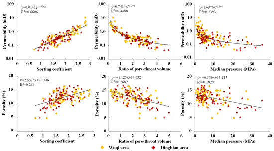 Correlations of pore throat characteristic parameters and physical properties of Chang 6 reservoir in Wu–Ding area, Ordos Basin.