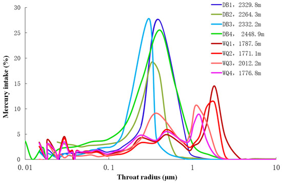 Statistics of distribution peak of pore throat radius in reservoir of Chang 6 reservoir in Wu–Ding area, Ordos Basin.