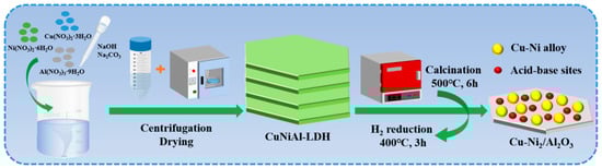 The CuNiAl hydrotalcite was subsequently calcined in a muffle furnace at 500 °C for 6 h to obtain CuNiAl mixed metal oxides. The metal oxides were then subjected to hydrogen reduction. The samples were placed in U-shaped quartz tubes and purged with argon before being heated to 100 °C at a rate of 10 °C/min for 1 h. Following this, the atmosphere was switched to argon containing 10% H2, with a flow rate of 40 mL/min. The temperature was raised to 400 °C and maintained for 3 h for reduction. This process resulted in the formation of the Cu-Ni bimetallic catalysts. The preparation process is shown in Figure 1.