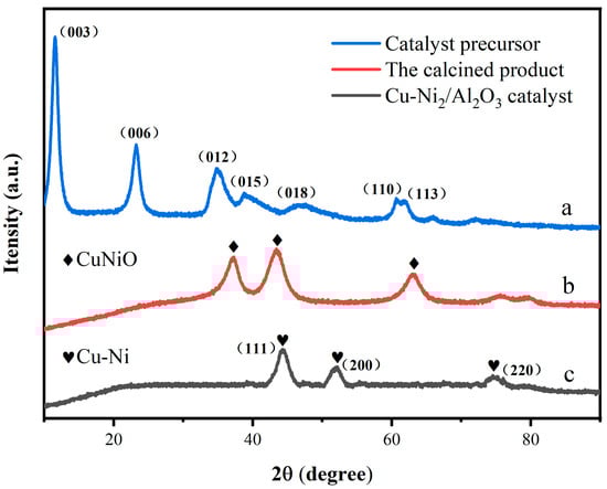 XRD pattern of the catalyst precursor, calcined product, and Cu-Ni2/Al2O3 catalyst. (a) Catalyst precursor. (b) Calcined product. (c) Cu-Ni2/Al2O3 catalyst.