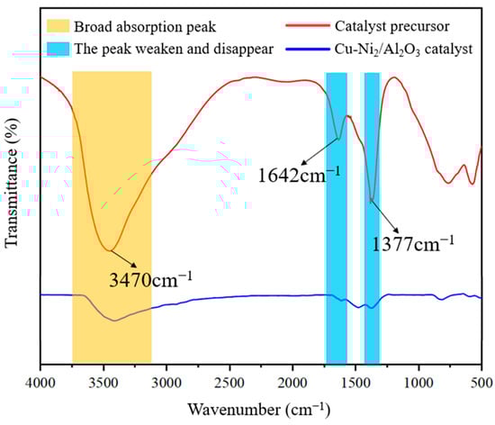 Figure 4 presents the IR spectra of the Cu-Ni2/Al2O3 catalyst and its precursor. As observed in the figure, a broad absorption peak around 3470 cm−1 is attributed to the stretching vibration of hydroxyl groups both within and between the layers [35]. The absorption peak at 1642 cm−1 corresponds to the bending vibration of -OH groups in water of crystallization [36]. Additionally, the peak near 1377 cm−1 is associated with the asymmetric stretching vibration of interlayer CO32− ions [37,38]. Absorption peaks at lower wavenumbers correspond to interlayer cation (M) vibrations and metal–oxygen bonds (M-O, M-O-M, and O-M-O) [39,40]. The figure shows that after calcination at 500 °C, the characteristic peaks of the catalyst precursor in the 1200–1700 cm−1 range disappear. The IR spectral analysis further confirms the successful synthesis of the Cu-Ni2/Al2O3 catalyst.