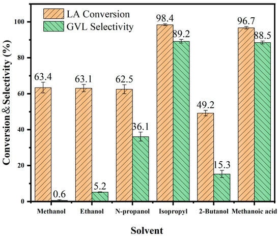As illustrated in Figure 6, the selectivity for GVL is relatively low when methanol and ethanol are utilized as hydrogen-donating solvents, yielding only 0.6% and 5.2%, respectively. This low selectivity can be attributed to the limited hydrogen supply capacity of these solvents, which leads to the predominance of esterification products of LA. In contrast, the effects of n-propanol and isopropanol on GVL yield differ significantly. Specifically, the yield increased to 89.2% when isopropanol was employed, likely due to the propensity of secondary alcohols to generate ketones via β-H elimination. This process releases hydrogen atoms that facilitate the hydrogenation of carbonyl (C=O) groups, thereby enhancing GVL yield. Conversely, primary alcohols such as n-propanol may have negative effects, as the alkoxyl group can occupy the catalyst’s active sites, and its oxidation product, aldehyde, may contribute to catalyst deactivation. The use of 2-butanol resulted in a yield reduction to 15.3%, attributed to spatial site-blocking effects stemming from its longer carbon chain. Notably, while formic acid is not an alcohol, it exhibits good hydrogen supply capacity, resulting in GVL selectivity of 88.5%. Based on the analysis of various hydrogen-supplying solvents, it can be concluded that isopropyl alcohol is the most effective solvent for hydrogen supply, significantly enhancing the yield of GVL.