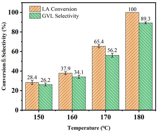 According to the experimental results, at a reaction temperature of 150 °C, the reaction rate was low, leading to slow progression. This phenomenon is likely due to insufficient heat for the dehydrogenation of isopropanol during the reaction. The inadequate temperature failed to provide the necessary energy, resulting in a slower rate of hydrogen detachment and limiting isopropanol’s hydrogen supply capacity. Consequently, the conversion of LA was only 28.4%, with a selectivity for GVL of just 26.2%. Upon increasing the reaction temperature to 160 °C, the reaction rate increased significantly, with the conversion of LA and selectivity for GVL reaching 37.9% and 34.1%, respectively. This indicates that elevated temperature promotes the reaction. Further raising the temperature to 170 °C further increased the reaction rate, with LA conversion and GVL selectivity rising significantly to 65.4% and 56.2%. This enhancement suggests that the dehydrogenation of isopropanol by the Lewis acid sites on the catalyst was facilitated, thereby increasing the reaction rate [41]. Ultimately, at a temperature of 180 °C, the conversion of LA reached 100%, while the selectivity for GVL attained 89.3%, confirming the efficiency of the reaction. This finding further confirms that increasing temperature effectively promotes the dehydrogenation reaction of isopropanol and accelerates the conversion of LA to GVL.