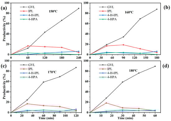 In the transfer hydrogenation of LA, it is essential not only to examine the effect of reaction temperature on LA conversion and GVL selectivity but also to examine the combined influence of reaction temperature and reaction time on GVL yield. By-products and intermediates generated during the reaction can significantly affect GVL yield, as their formation depends on both temperature and time. Therefore, a systematic investigation of the composition and yield of reaction products at various temperatures and reaction times is necessary to optimize the process.