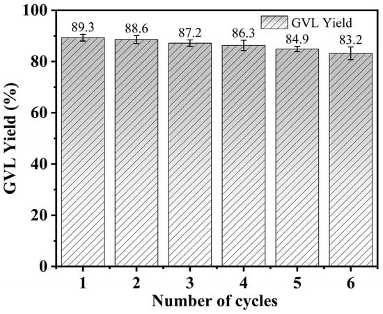 Catalyst recyclability is crucial for evaluating catalytic performance. To assess the stability of Cu-Ni2/Al2O3, we conducted multiple recycling tests, using GVL yield as the criterion. As shown in Figure 10, the Cu-Ni2/Al2O3 catalyst exhibited excellent performance in these tests. The yield gradually decreased from 89.3% in the first cycle to 83.2% in the sixth cycle, a total decrease of ~6%, indicating high cycling stability. Compared with existing Cu-Ni bimetallic catalysts, the Cu-Ni2/Al2O3 catalyst maintains a high GVL yield after multiple cycles. For example, Liu et al. [42] prepared a hierarchical flower-like Ni-Cu bimetallic catalyst that achieved a GVL yield of nearly 80% after five cycles. Similarly, Wang et al. [34] developed a Ni-Cu bimetallic catalyst that catalyzed the production of 2-methyltetrahydrofuran from LA, with its GVL yield decreasing to 80.2% after six cycles. The high stability and activity of the Cu-Ni2/Al2O3 catalyst can be primarily attributed to the hydrotalcite precursor structure. The M2+ and M3+ metal cations in the hydrotalcite are uniformly dispersed within the layered structure [43]. They were confined by the lattice localization effect, allowing the catalyst to remain highly active and stable even after heat treatment. Additionally, the strong interaction between the LDH-derived metal components and the support effectively prevents sintering and agglomeration [44,45], reduces active center loss, stabilizes active sites, and further enhances catalyst stability. Furthermore, the controlled metal–oxide interactions optimize catalyst performance and contribute to long-term stability. The Al2O3 support, which contains strong basic sites, improves the hydrogen adsorption and dissociation capability of the metal centers, thereby enhancing catalytic activity. Moreover, Cu and Ni are firmly embedded within the Al2O3 matrix, forming stable and highly effective catalytic active centers.