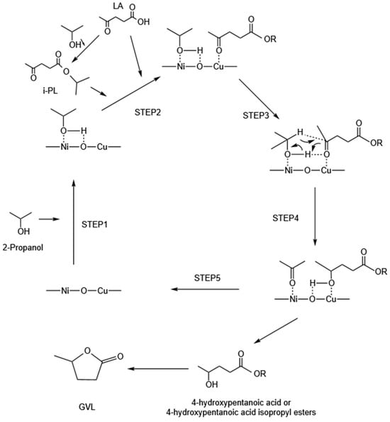 As shown in Figure 11, the Cu-Ni2/Al2O3 catalyst plays a key role in converting LA to GVL. This process involves isopropanol adsorption and activation, LA hydrogenation, and lactonization, ultimately forming GVL. In the first step, isopropanol adsorbs on the catalyst surface. It then dissociates through the synergistic action of Lewis acid sites from Al2O3 and basic sites from Ni/Cu, forming the corresponding alcohol salts. This step is crucial for α-H activation and provides a proton source for subsequent hydrogen transfer [48]. Meanwhile, under suitable acidic conditions, LA undergoes esterification with isopropanol to produce IPL. This intermediate further participates in GVL formation [49]. In the second step, the carbonyl groups (C=O) in LA and IPL are first activated by Cu species, making them more reactive in the hydrogen transfer process [30]. Isopropanol undergoes β-H transfer at the Cu/Ni active sites, forming a six-membered ring intermediate. This step is a typical MPV hydrogen transfer mechanism. In this process, isopropanol acts as a hydrogen donor and provides a hydrogen source for the reduction of the carbonyl group, thereby gradually reducing LA to 4-HPA [28]. In the final step, 4-HPA undergoes intramolecular dehydration under the influence of Brønsted acidic sites on the catalyst surface, leading to the formation of GVL. Brønsted acidic sites promote 4-HPA cyclization, while Cu species enhance carbonyl activation and hydrogen transfer, thus improving catalytic efficiency [50,51,52].