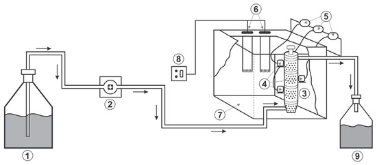 Schematic drawing of the experimental system used in continuous ethanol fermentation in a multi-stage fixed bed tubular bioreactor with external gas-liquid separators (Legend: 1—feed medium reservoir, 2—peristaltic pump, 3—fixed bed bioreactor, 4—gas–liquid separators, 5—solenoid valves, 6—electrical resistance, 7—thermostatic water bath, 8—temperature controller, 9–fermented medium reservoir).