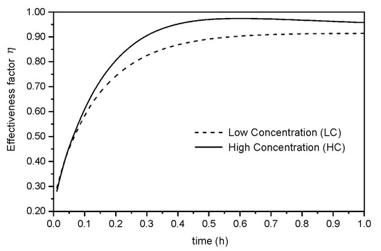 After approximately 0.30 h for the fermentation with high substrate concentration in the feed and 0.60 h for the fermentation with low substrate concentration, the effectiveness factor reaches values above 0.9. These times are negligible when compared to the transient regime duration times at each operation .