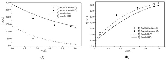 Equation (20) states that, at the entrance of the reactor, the feed mass flow is partitioned in two superimposed contributions: convective and diffusive–dispersive parts. Equation (21) establishes that dispersion and reaction do not occur from the reactor’s exit, making the substrate and product downstream concentrations constant.