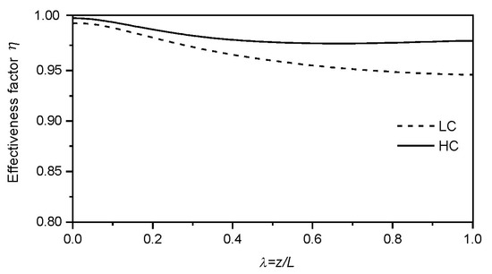 Figure 7 shows the behavior of the effectiveness factor along the bioreactor in the steady state. Effectiveness factors close to 1 are observed for both substrate concentrations used in the feed stream. It is verified that the operation with high substrate concentration in the feed provides effectiveness factors slightly superior to those obtained in the operation with low concentration, probably because in the operation with high concentration there is a greater diffusion of substrate of the phase fluid to the interior of the particle, which results in a higher average reaction rate in the particle, thereby increasing the effectiveness factor. Moreover, the slight decline in the effectiveness factor from the bioreactor’s inlet to its outlet is attributed to the progressive increase in the ethanol concentration in this direction, enhancing its inhibitory effect on the substrate consumption rate within the particle and thus decreasing its catalytic effectiveness. The high values of the effectiveness factor calculated in this study are in agreement with those calculated by Hamamci and Ryu [46], Converti et al. [11], and Ramakrishna et al. [47], when they operated packed bed bioreactors for ethanol production using immobilized yeasts in different support materials.