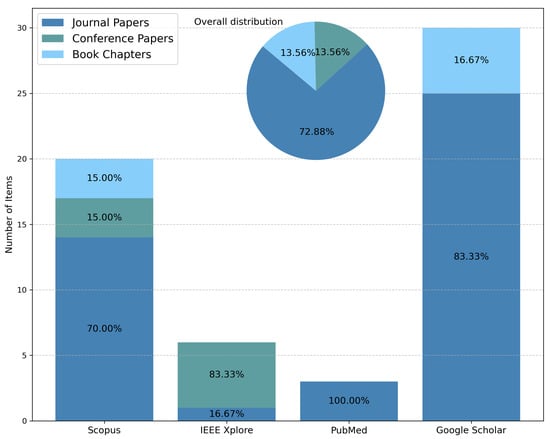 We will conduct a structured literature search and review on sustainable inventory management practices in Industry 4.0 based on the systematic approach proposed by Muka et al. [27]. The first step was to investigate whether the topic had already been reviewed, and we were able to check that several reviews have been developed since 2024 that are relevant to the subject of the present work. However, none of these works specifically focus on a broad analysis of sustainable inventory management in Industry 4.0. This motivates us in our the present review to propose a more comprehensive and unique categorization of papers while incorporating the most recent contributions in the field. To ensure a thorough and diverse collection of relevant studies, a literature search was carried out across four major scientific databases, namely Scopus, IEEE Xplore, PubMed, and Google Scholar, each of them offering distinct advantages in terms of indexing peer-reviewed journals, conference proceedings, and multidisciplinary research. Figure 1 outlines the publication items by the database. A total of 59 papers have been collected, all within the time range of 2024 to the present. These papers have been categorized by type (journal papers, conference papers, and book chapters). The bar chart illustrates their distribution across the databases, while the pie chart provides an overview.