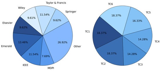 After compiling all the references and abstracts into a single document, we conducted a thorough screening process to eliminate duplicates, reducing the total number of items for analysis from 59 to a smaller, refined set comprising 52 items. Next, we grouped these filtered papers based on their publishers and performed an in-depth analysis to determine their core subject matter. Each paper was assigned to one of six distinct topic categories (TCs) during the classification process. This process was conducted by carefully examining each paper’s abstract, objectives, methodologies, and main contributions. We employed a qualitative content analysis approach to identify the dominant theme of each work, considering both explicit keywords and the underlying research aims. Full texts were consulted to clarify the primary focus along with the abstracts. The six topic categories were derived based on recurring patterns across the literature, ensuring that each category reflects a coherent thematic area. This method allowed for consistency in classification while remaining flexible enough to accommodate interdisciplinary studies that overlap across themes. The distribution of the analyzed papers, both by publisher and their assignment to TC, is illustrated in Figure 2. This figure provides an overview of how the papers are grouped based on their source and how they have been categorized according to their primary subject matter. Since some papers address multiple topics, we categorized each based on its most relevant primary focus while acknowledging its potential significance in other areas. This approach ensures that the classification remains structured and meaningful while preserving the awareness of interdisciplinary connections. The following sections provide a detailed description of each TC.