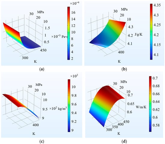 Schematic diagrams of the changes in the physical parameters of water as a function of temperature and pressure. (a) The dynamic viscosity of water as a function of temperature and pressure. (b) The atmospheric heat capacity of water as a function of temperature and pressure. (c) The density of water as a function of temperature and pressure. (d) The thermal conductivity of water as a function of temperature and pressure.
