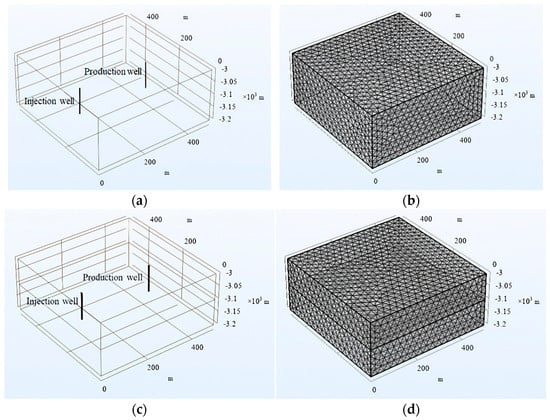 Geological models for high-temperature thermal storage simulation at a depth of 3000 m. (a) Fracture−free geological model. (b) Fracture−free geological model grid. (c) Fracture−bearing geological model. (d) Fracture−bearing geological model grid.